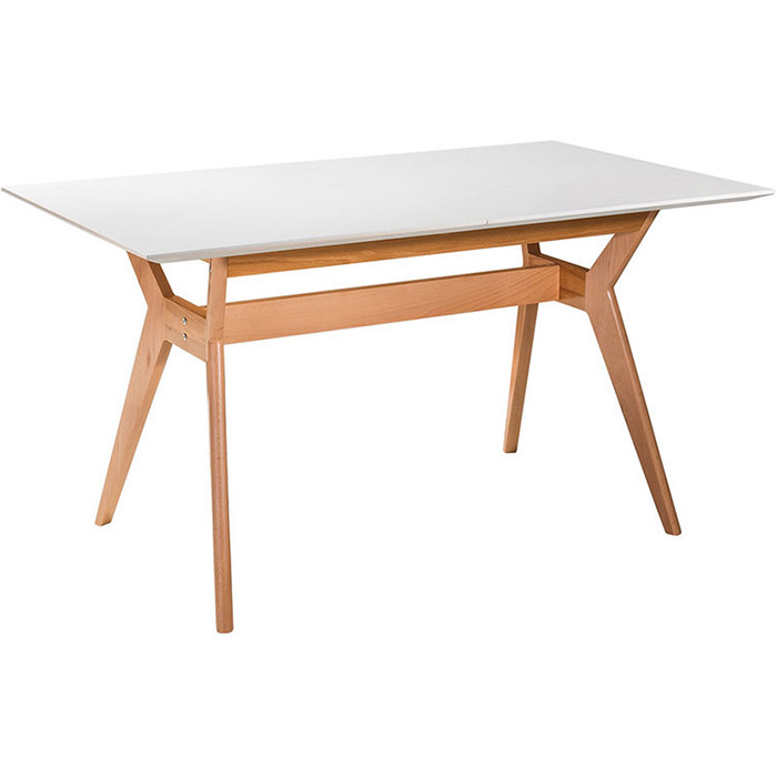 Прямоугольная форма визуально делает интерьер более уютным. Стол особенно подойдет под современные стили контемпорари и хай-тек. Опоры из натурального дерева хорошо сочетаются со светлыми поверхностями и каменным рисунком на ламинате или плитке.